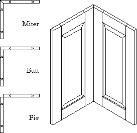 Three types are available: Miter, Butt and Pie.  Both stiles on the Miter will be wider in the corner with the miter cut matching the thickness of the door.  The Butt corner will have 1 wider stile.  The pie will have standard-size  stiles in the corner.  Both the Butt and Pie will have square corner outside edge profiles in the corner.