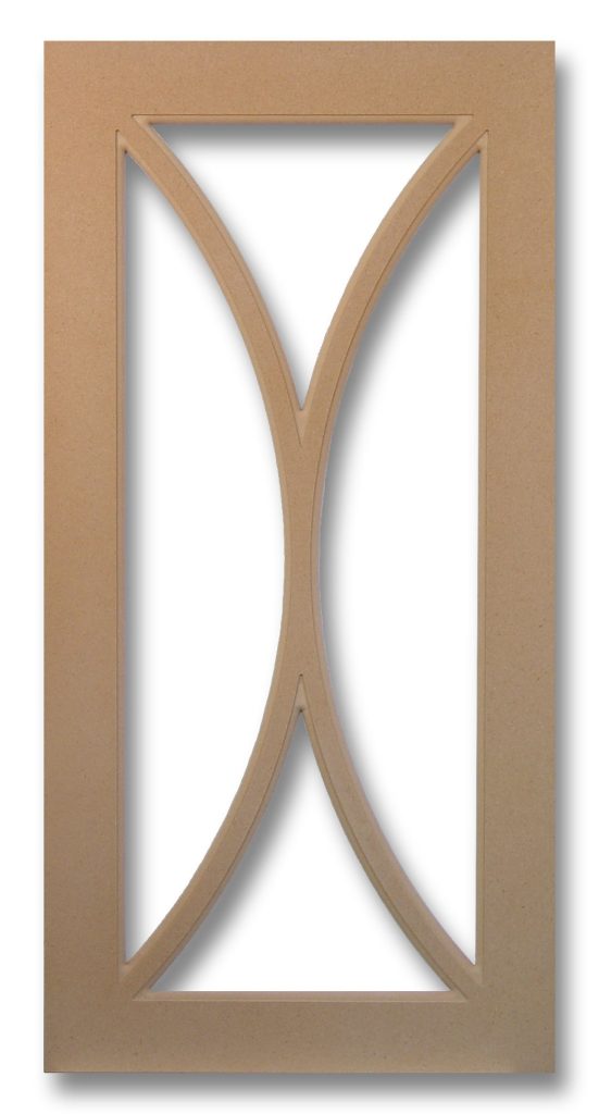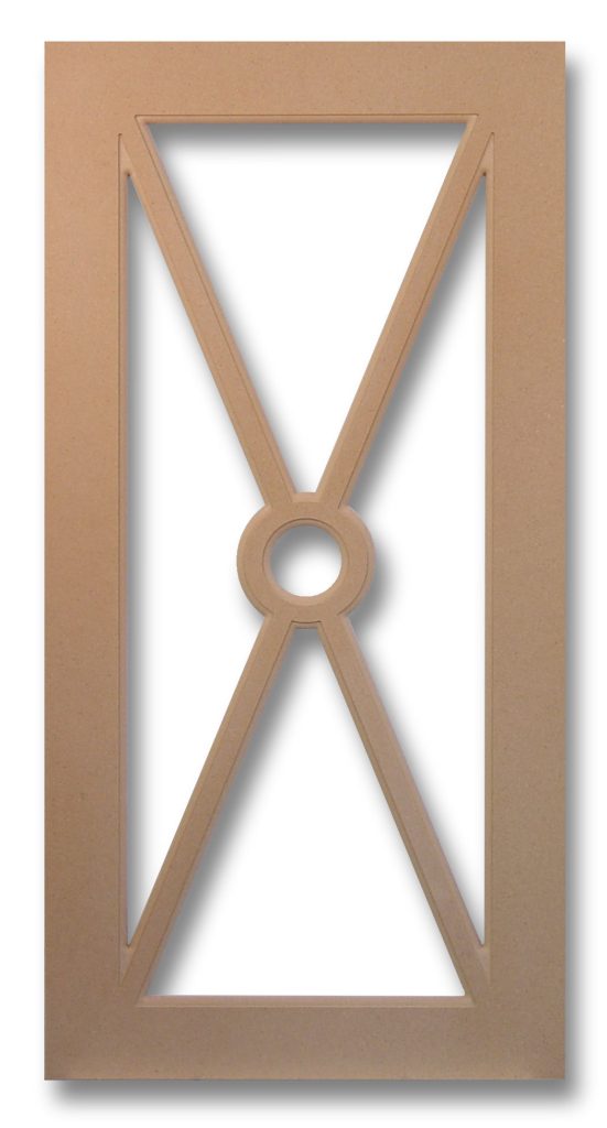 These machined MDF mullion grids are experimental at this point, but are available to a limited extent. Eventually they may come to be offered in our standard catalog at standard prices, but for now the process is still in its infancy and therefore it isn’t easily repeatable. If you see a mullion grid design you like above or if you can give us a not-too-complicated sketch or picture of a design, we may be able to do this for you (no guarantees!) As of right now, for each door that is different in size or design there is a separate design rate of $100/hr on top of the standard rate for MDF slab doors. To help give you an idea how much these doors may cost, a set of four of the Shackled ‘X’ doors that are all the same size would cost roughly $160 per door. The Sunburst Top Arch style in the middle would likely cost $200 per door as they take longer to design and set tool paths for. If each door is a different size or design, this will drastically increase the cost per door! Again, these are not set prices, but simply meant to give you an idea. The price on your custom mullion grids will depend almost entirely on the size and complexity of your design.