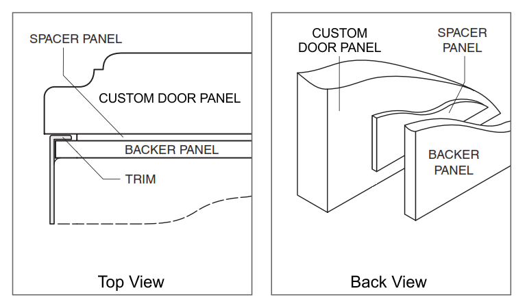 • When ordering, supply the exact size of the decorative door panel. The size of the Spacer Panel, including thickness (e.g. 1/10″) and the Backer Panel along with thickness (e.g. 1/4″).
