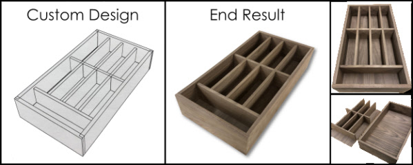 Want custom designed partitions and dividers for inside your drawer boxes? Yes we can do this with an example in walnut wood shown to the left. Let us know how you want this laid out and we will build the partitions and dividers how you have them laid out for inside the drawer boxes. You can go with a basic design to a very detailed design with this option. The limit is up to you.