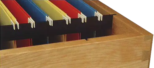 Hanging files install easily with pre-cut slots in 10” tall file drawers. The rail is 1/8” by 3/4″ for spans up to 24”, and 1/8” by 1” for spans over 24”. We can supply the rails with the drawers, or you can supply your own, let us know when you are placing your order. Specify whether you want legal and/or letter files and how you want them positioned.