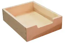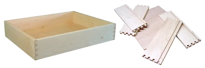 Our dovetail drawer boxes have 5/8” thick solid wood sides. The bottoms are made out of 1/4″ thick plywood. Drawer boxes can be ordered unassembled, assembled, or assembled and clear finished.