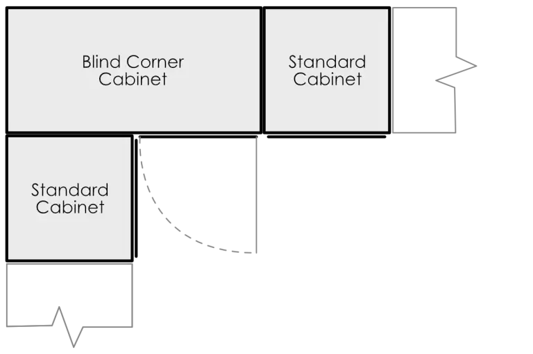Blind Corner Cabinet: A blind corner cabinet is a cabinet situated at the intersection of two perpendicular rows of cabinets that normally meet in the corner of a room. In order to access the cabinet, it typically needs to be constructed wider (or longer) than normal so that enough of the cabinet extends out from the corner in order to create a functional opening. This, however, creates a problem for people to reasonably access every portion of the inside of the cabinet. Half or part of the inside of the cabinet is not visible, hence its name: the “blind corner cabinet.” Special blind corner cabinet hardware can be provided and/or installed for you as an upgrade.
